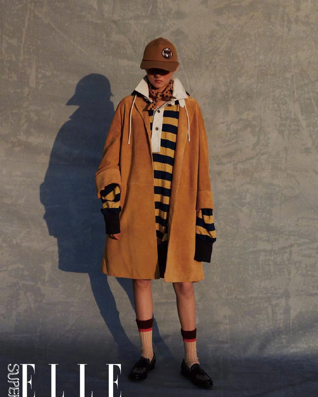 站在灰色的背景墙前,关晓彤身穿蜂蜜色条纹裙,看大的白色翻领内系上橘色波点丝巾,头戴脏橘色棒球帽,微微露出"晒红"的脸蛋,身上搭配米棕色呢绒大衣,下半身露出半截双腿,穿上条纹袜以及黑色皮鞋,这样一套美式复古造型搭配在关晓彤身上很是OK。