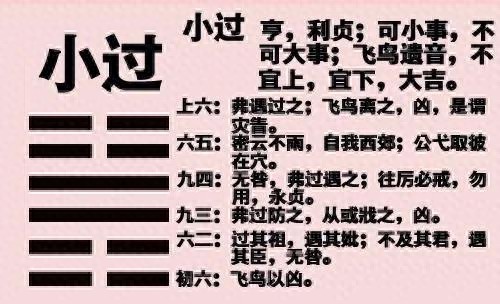 小过:亨,利贞。可小事,不可大事。飞鸟遗之音,不宜上,宜下,大吉。