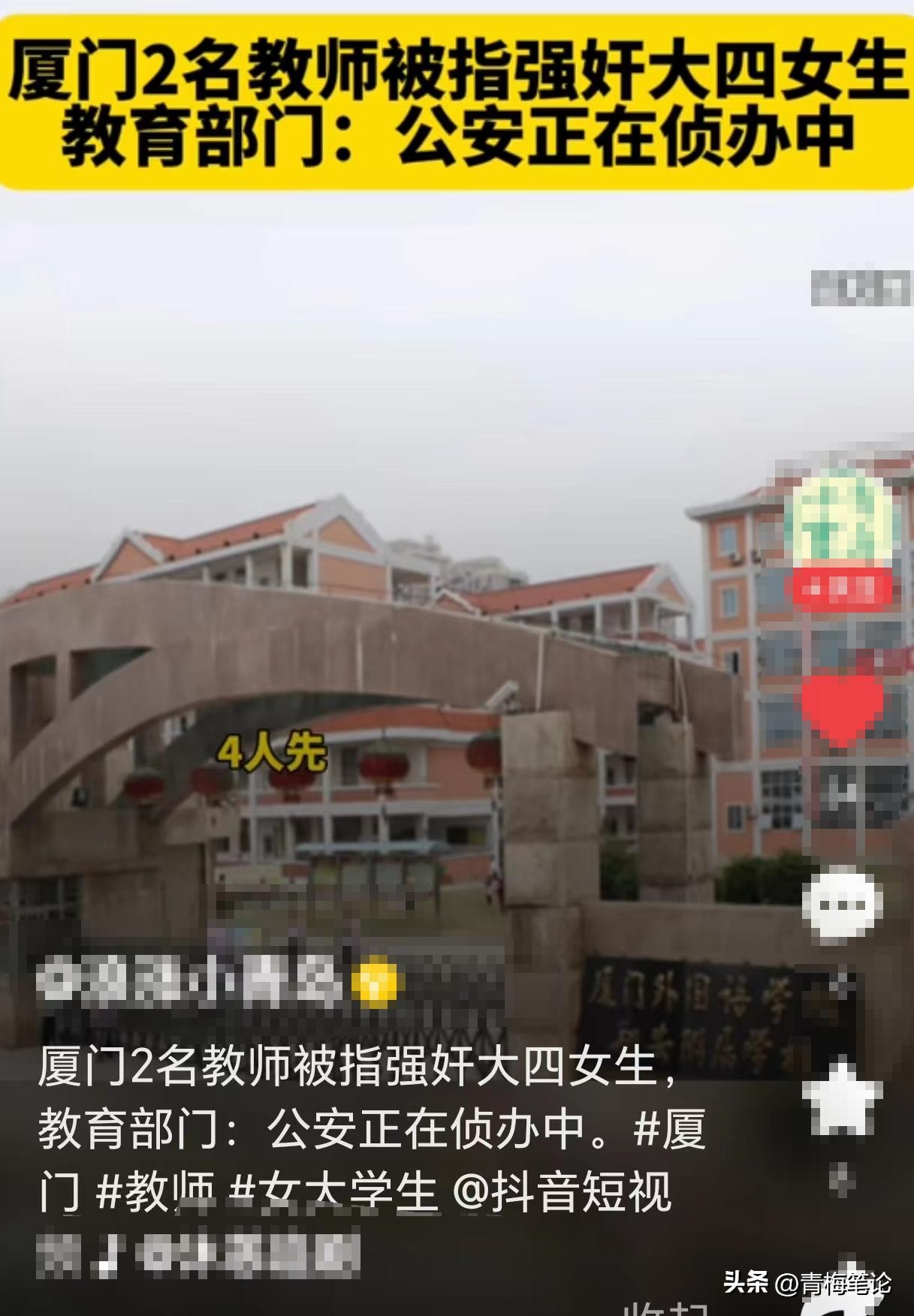 12月4日晚,“厦门知名中学的多名教师在酒后侵犯女实习生”的网帖引发关注。