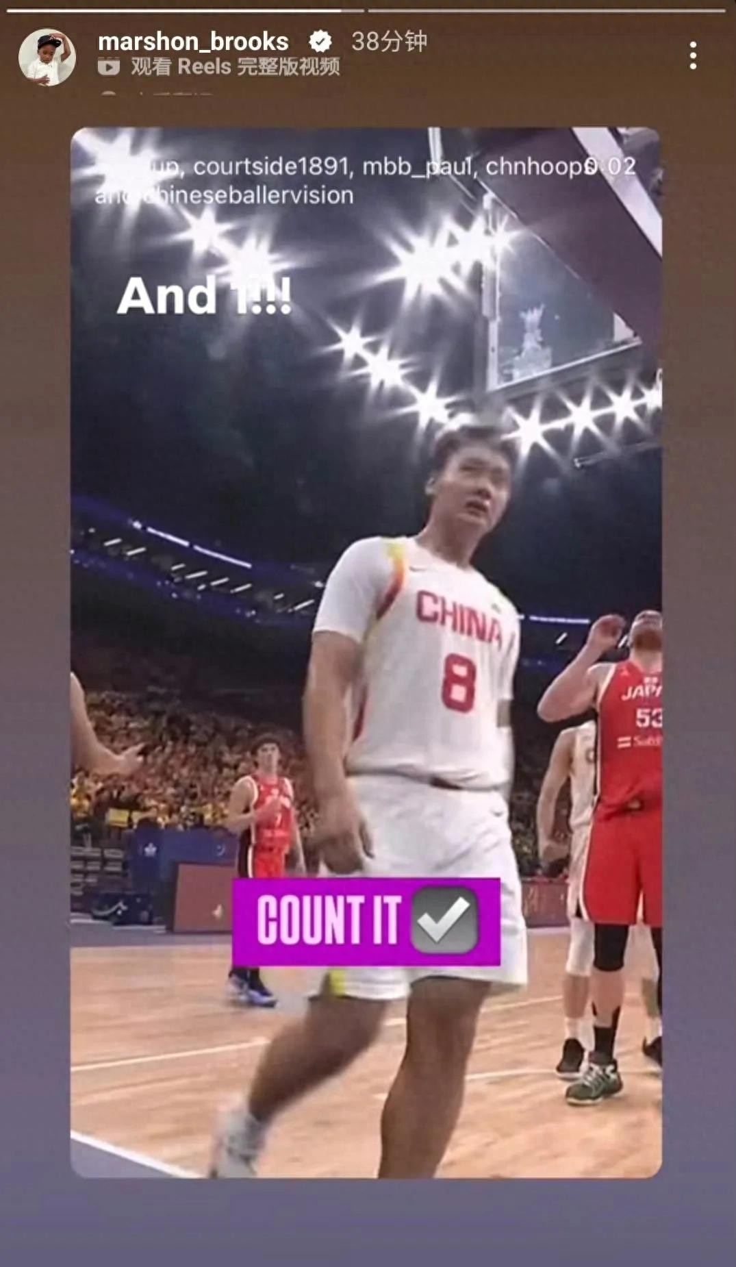 近日前广东功勋小外援马尚布鲁克斯在个人社媒转发了2月20日亚洲杯预选赛中国男篮对阵日本男篮比赛中赵睿在场上的高光表现。