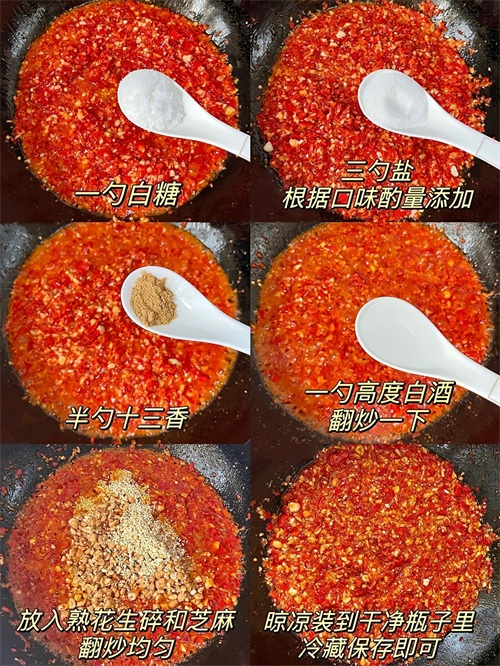 最后,加入熟花生碎和自芝麻,再次翻炒均匀。这样,辣椒酱的制作就完成了。将辣椒酱晾凉后,装入干净的瓶子中,并冷藏保存即可。