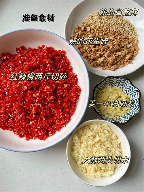 首先,我们需要准备一些食材。我们需要红辣椒、小米椒、花生醉、自芝麻、姜和大蒜。这些食材都是辣椒酱的必备原料,它们将为辣椒酱增添丰富的口感和味道。