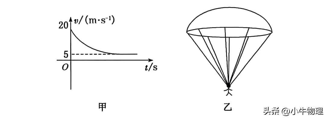 例题:某运动员做跳伞训练,他从悬停在空中的直升机上由静止跳下,跳离飞机一段时间后打开降落伞做减速下落。他打开降落伞后的速度图线如图a。降落伞用8根对称的绳悬挂运动员,每根绳与中轴线的夹角均为37°,如图b。