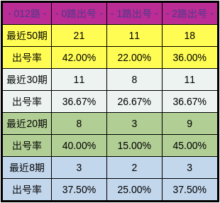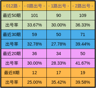 整体走势,通过50期数据对比看,0路较热,2路、1路开出率略低。