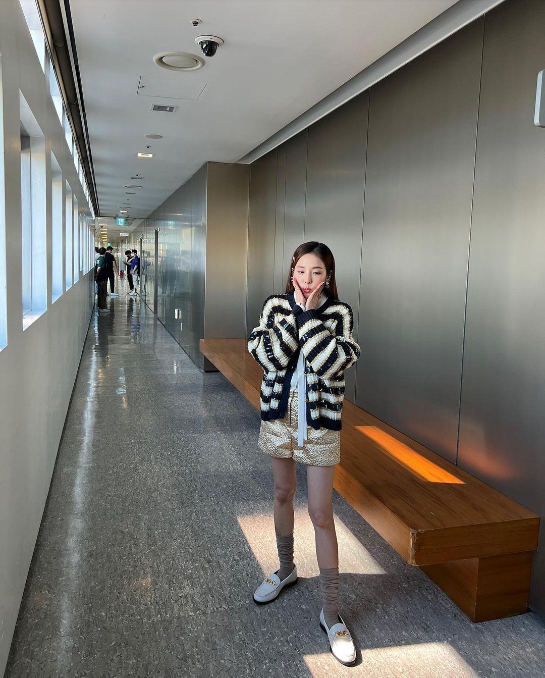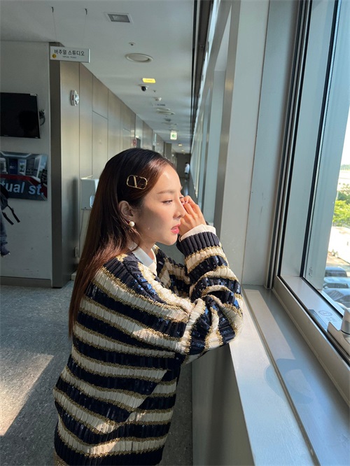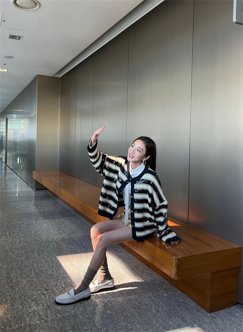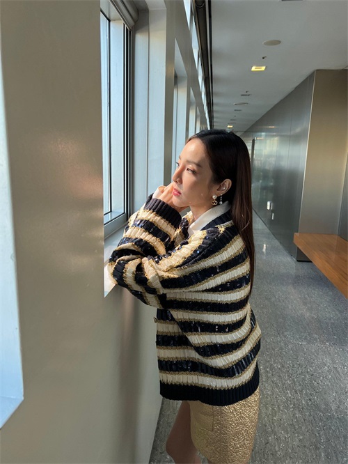 在公开的照片中,朴山多拉站在MBC大楼的走廊里,身穿白色衬衫,外罩黑白相间的针织长袖开衫,下身穿金色的短款,朴山多拉双手放在脸上做出可爱的姿态,以独特材质制成的条纹外套和金色短裤完成了奢华时尚。