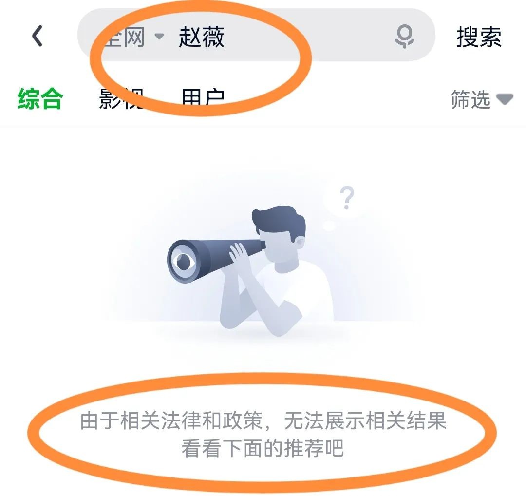 网友网站上搜索赵薇的名字,出现的是“由于相关法律,无法展示(与赵薇)相关结果”,网站上已经搜不到赵薇的任何影视剧、综艺和短视频了!