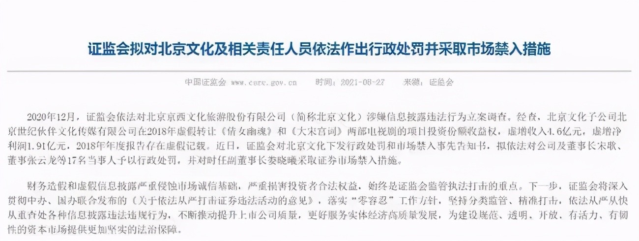 27日盘后,证监会公告称,拟对北京文化及相关责任人员依法作出行政处罚并采取市场禁入措施。