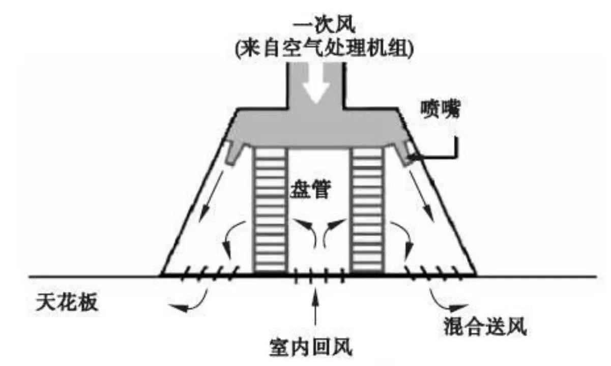 2)主动式冷梁:室外新风经空调箱处理形成干冷一次空气,送入冷梁,经喷嘴高速喷出,在箱体内形成局部负压,诱使室内冷梁附近的二次空气穿过冷水盘管,在经过热交换器的冷却后,与一次空气混合从两侧封闭的导流槽贴附送入室内,其温度低于房间温度。经过如此循环,室内的热量被冷却盘管带走。同样,在冬季,换热器中为热水,冷梁起到制热效果;
