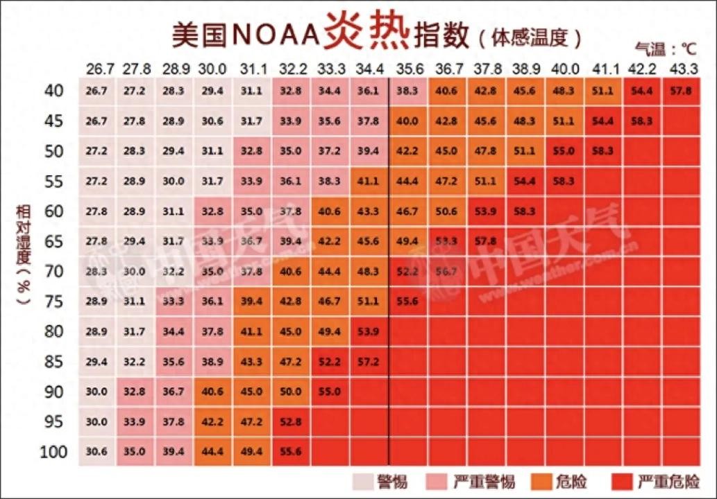 美国NOAA炎热指数是一个综合考虑温度和湿度对人体感温度影响的指标。它将湿度作为影响人体感温度的一个重要指标,在相同温度下,相对湿度越大,人的体感温度就越高。