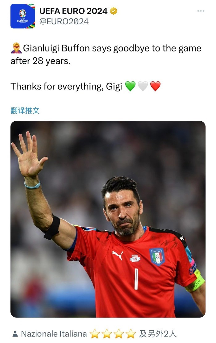 欧足联写道:“布冯告别了28年的职业生涯。感谢你所做的一切,Gigi。”意大利国家队点赞了这条文章。