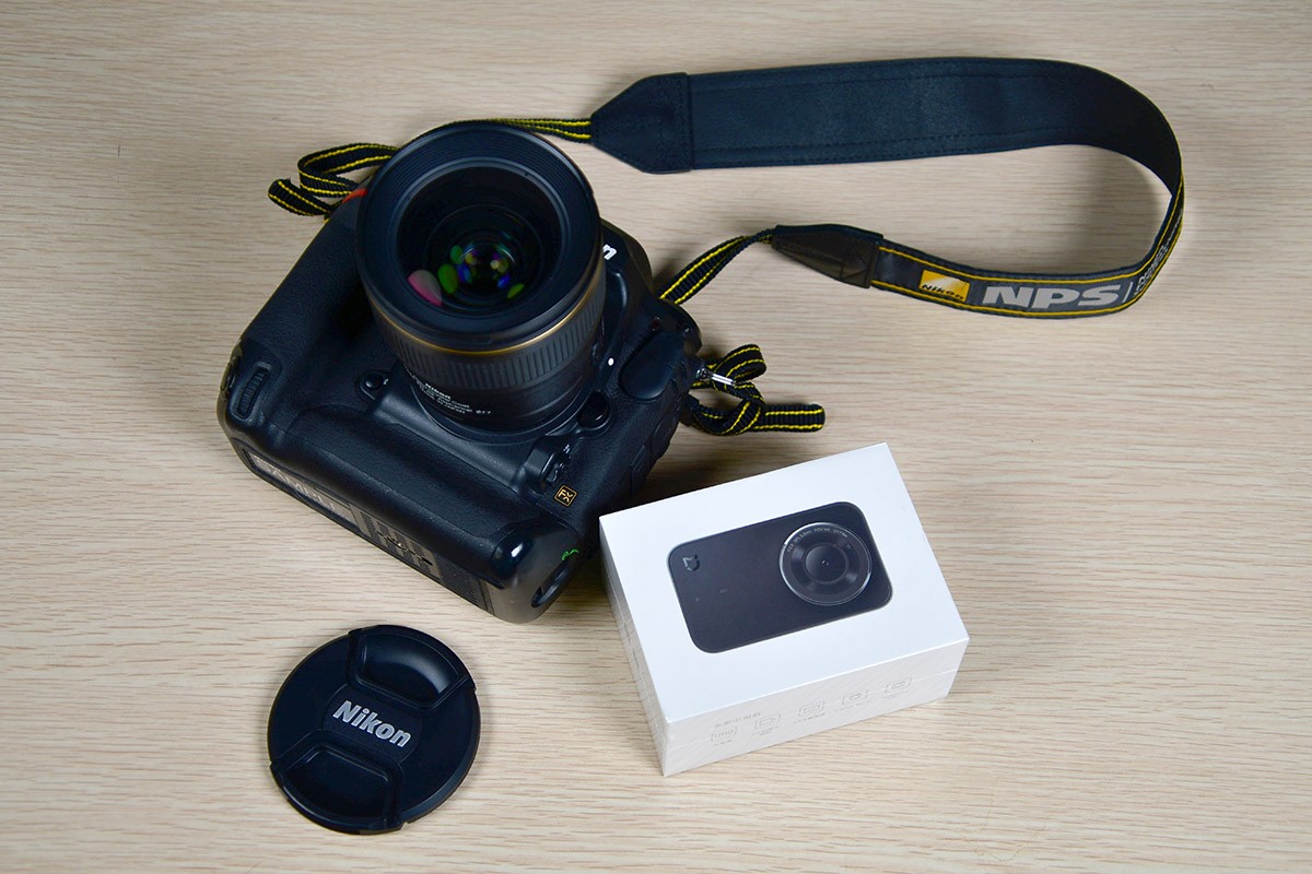 既然名字叫“米家小相机”,这货的体型确实极为小巧。我故意拿着它的包装盒和尼康D5座个对比,而它的产品实物其实就是包装图片上那个大小,用两根手指就能轻松握住。这台产品的包装盒内除了一根电源线和一份折叠的简要说明书外别无它物,整个主机的造型看起来让我马上想起了之前评测过的米家行车记录仪。考虑到米家小相机本身也是采用安霸方案(机身内还有循环录像功能),这货其实就是一个4K分辨率的行车记录仪附体吧?