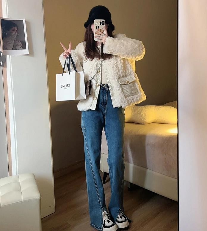 这一身“斩男风穿搭”相信很难会有人不爱吧?白色小香风外套,像这种短款,实在是太合适小个子了,对吧?搭配高腰直筒长裤,这种挺括的裤子版型,可是太显腿瘦了,也很藏肉!