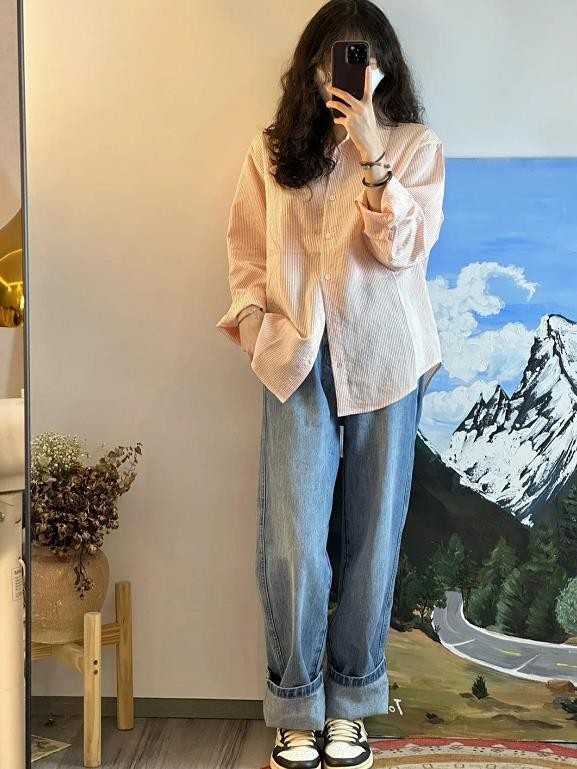 其实,像牛仔裤这种裤子,与什么样的上衣相配都是超赞的,宽松版型的牛仔裤,真的很藏肉显瘦。而且,还能给人一种很休闲舒适的效果,裤子过长的话,可以稍微把裤脚卷起来一些,增加些随性感。