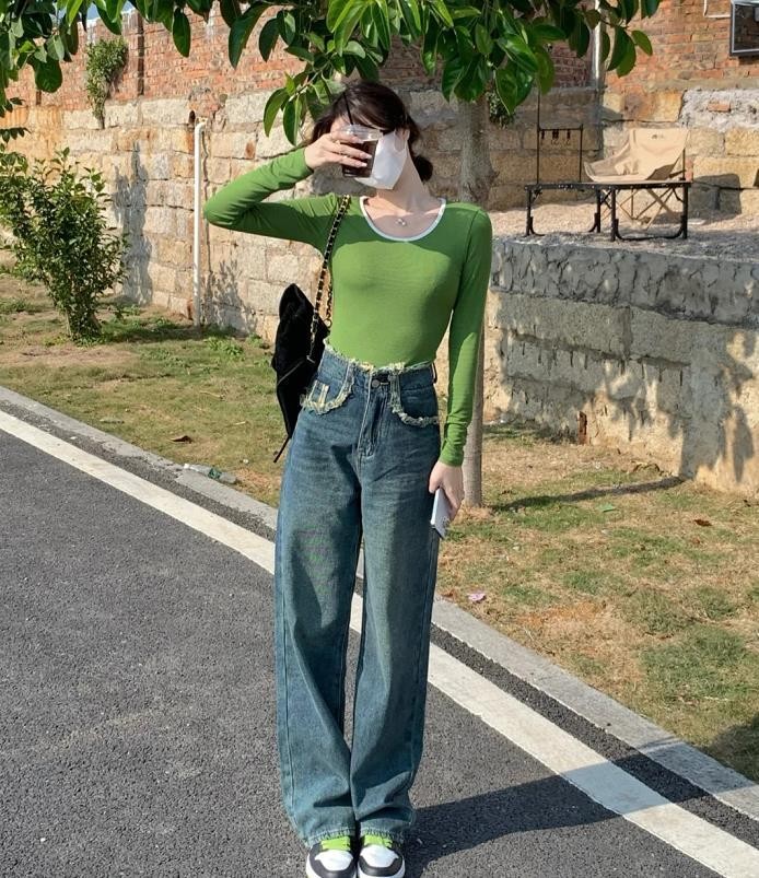 小个子的女生,在选择牛仔拖地裤来穿时,一定要记得把腰线比例给提高起来,这样才能将身材比例进行优化了。