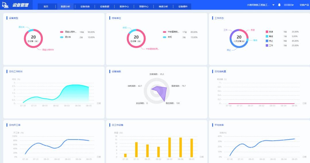 通过将这些采集到的数据自动上传到软件后台,借助人工智能算法判断机械的工作状态(运动、静止、怠速),形成统计工时表,并记录GPS轨迹,做到足不出户掌控一切,及时调度,灵活指挥。