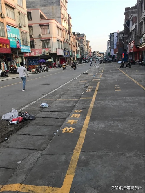 路边画有公共停车位,这在乡镇并不多见,这点很不错。只是路边的垃圾有点扎眼。