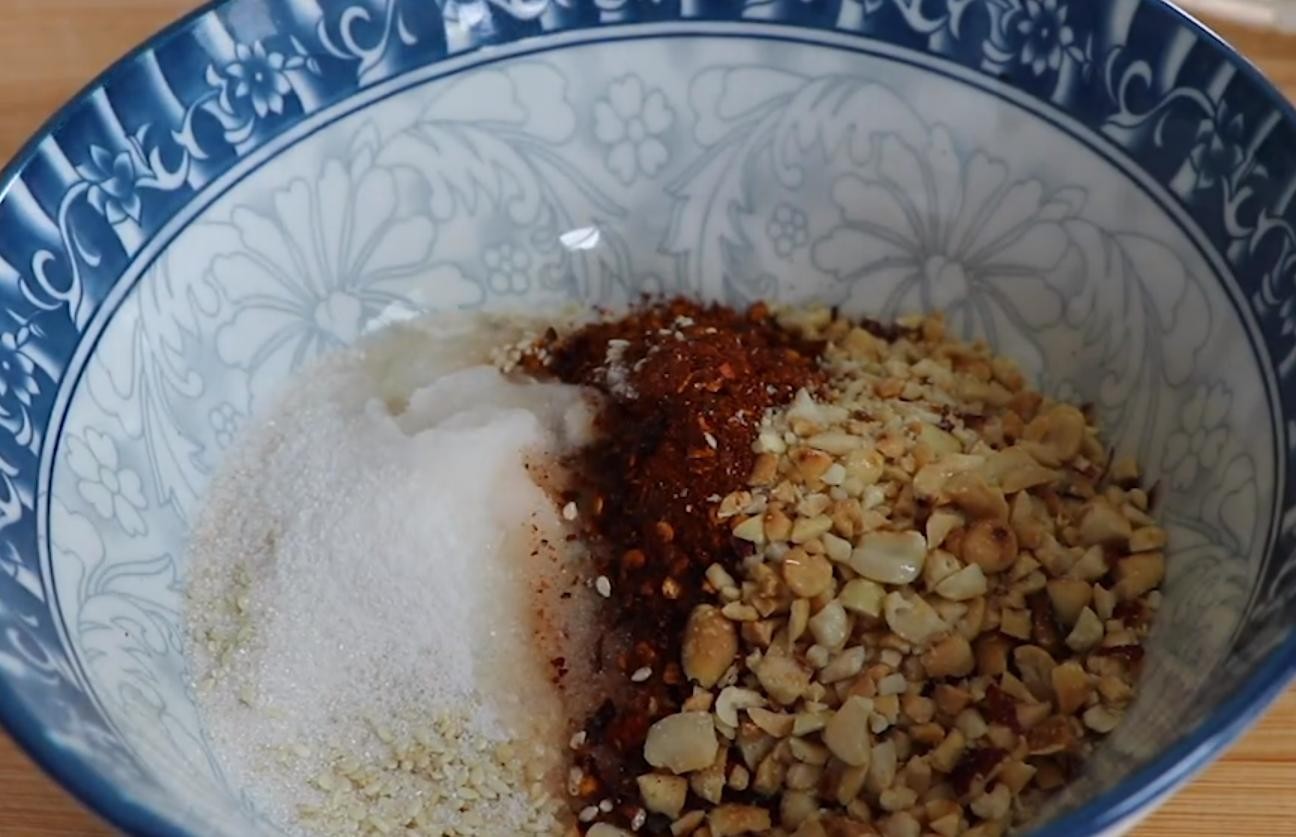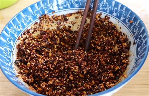 3,做一个辣油:碗中加入50克辣椒粉,一勺白芝麻,一勺花生碎,一勺白糖,一勺食盐,淋上一勺高度白酒。