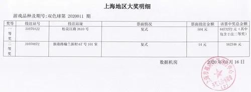 数据显示,上海地区一等奖彩票售出于松花江路2610号福彩销售点,该票还中得2注二等奖,奖金共计6473272元。此外,上海还另中得1注二等奖,单注奖金161146元,彩票售出于新港路榆兰新村67号101室。