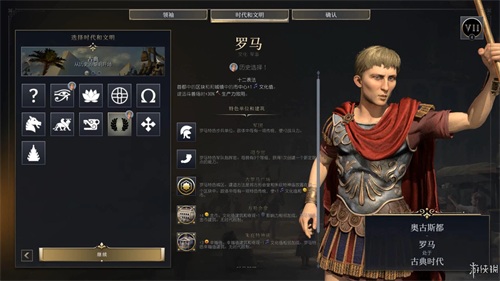 然后是文明势力的选择,每个时代的首发文明势力都在10个左右,每个势力都会有自己独特的军事单位以及特色机制与建筑。同时,为了结合“时代更迭”的玩法,每个文明都会一些后续可替换文明的备选项,让玩家能够流畅完整地体验一局游戏。