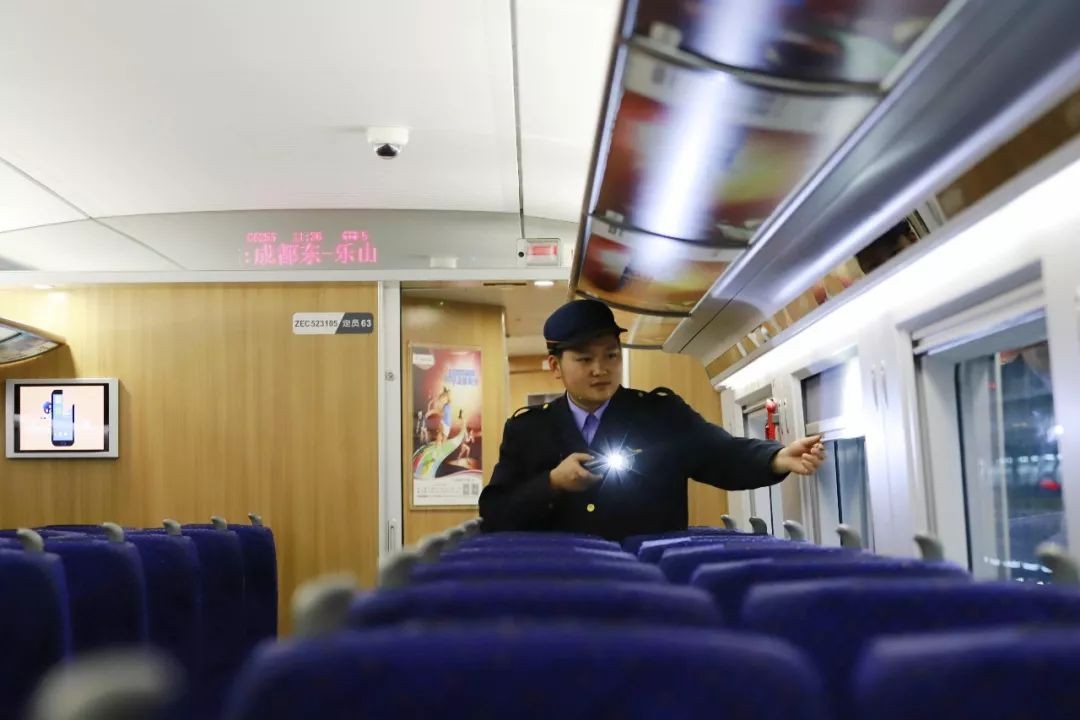 车厢内部干净整洁,工作人员也在一丝不苟地检查。