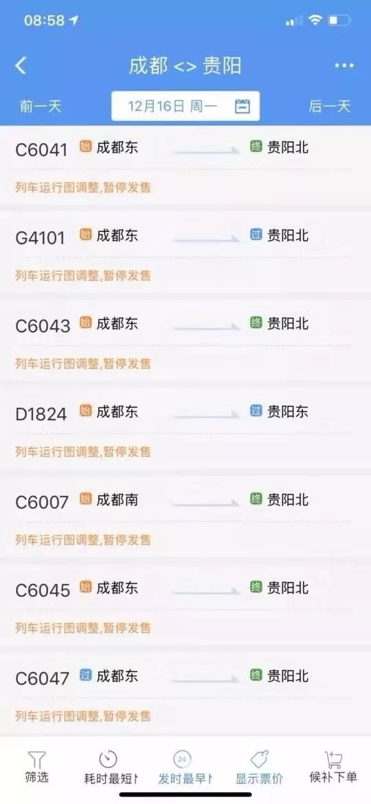 12 月 13 日 晚,成贵高铁末通段——宜宾至贵阳共 9 个新建车站(其中贵州 5 个)录入 12306 售票系统 12 月 16 日及以后日期中,贵阳北至这 9 个车站以及宜宾、成都东等城市均有" C "字头车次显示。