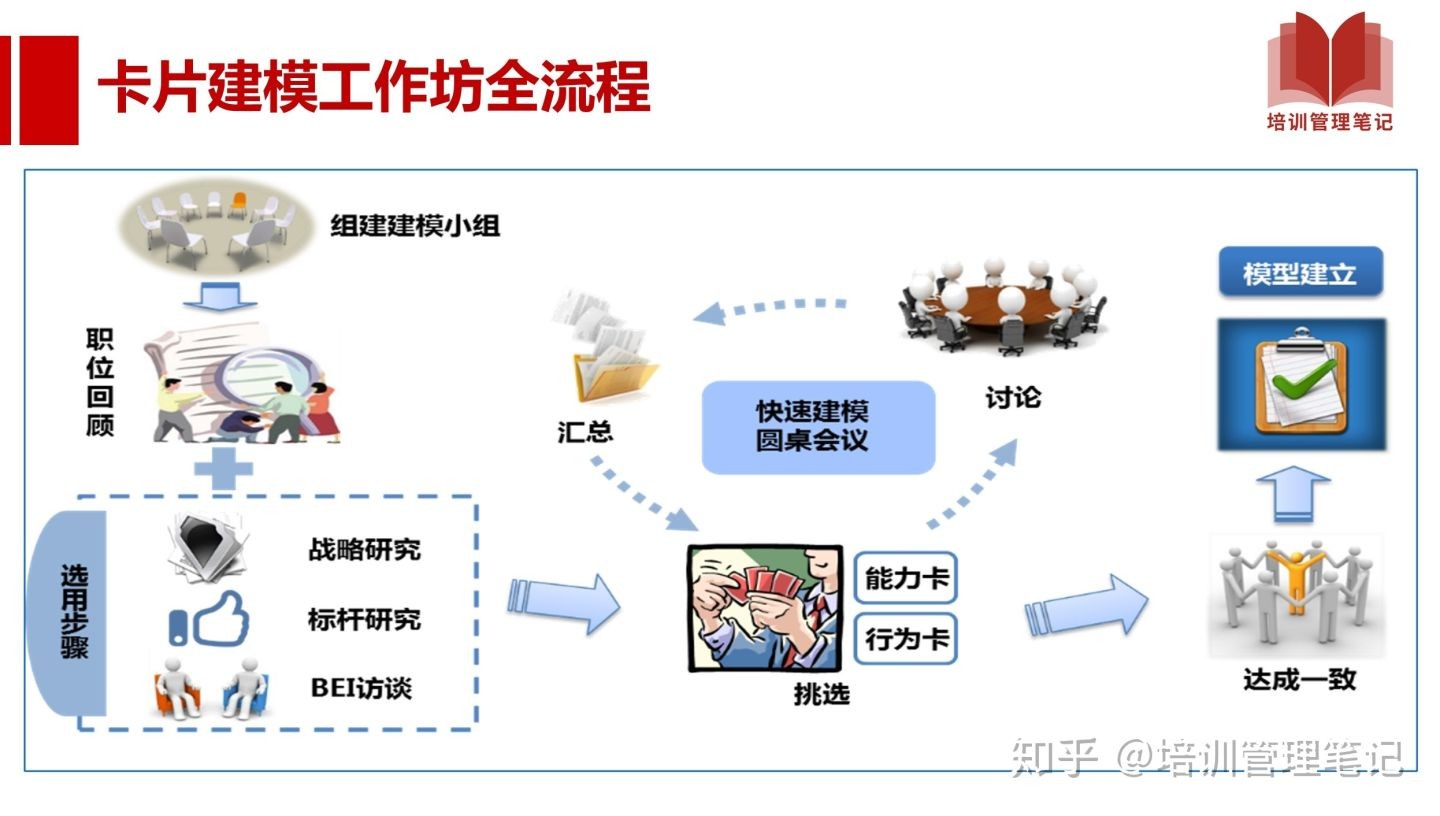 通过不同的流程,排卡以及每一轮的讨论,培训者会作为一个引导师的角色不断抛出问题,让参与者讨论出关键行为的要素以及关键的成功事件。并且挑选出岗位好的绩优人员的胜任力要素,最后建立出胜任力模型。