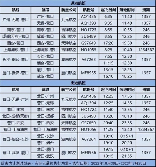 营口机场冬航季航班时刻表来啦!