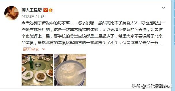 事情是这样的,9月24日,拥有四百万粉丝、人称“水哥”的微博科普博主@闲人王昱珩对厉家菜进行吐槽,称“这是一次非常糟糕的体验,无论环境还是菜的色香味,如果这个也能评上一星,那学校的食堂应该都是二星起步了”。之后,厉家菜工作人员回应称:“他要觉得不值,我们也没有办法”自此便掀起了网友的无数吐槽。