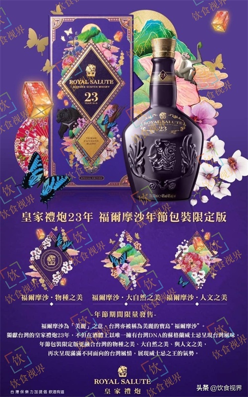 除了2022年皇家礼炮21年祥狮献瑞年节限定版以外,皇家礼炮还在中国农历新年之际,为中国台湾推出了一款——皇家礼炮23年福尔摩沙年节限定版。这款酒以皇家礼炮23年为基础,其酒龄为23年,酒精度数为40% ABV,容量为700ml。除包装以深紫色为底色以外,瓶身也沿袭了皇家礼炮23年的深紫色。
