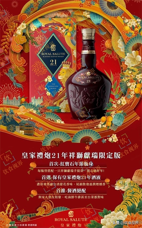 皇家礼炮首次推出两款“大红大紫”农历春节限定威士忌,寓意龙腾虎耀、祥狮献瑞。其中“大红”色的农历新年限定21年,官方建议零售价为3080元新台币,另一款“大紫”色的农历新年限定23年,官方建议零售价为4080元新台币。目前这两款酒已在中国台湾上市开售,如果您感兴趣,且身在台湾,或在台湾有购酒渠道,可以去看看。