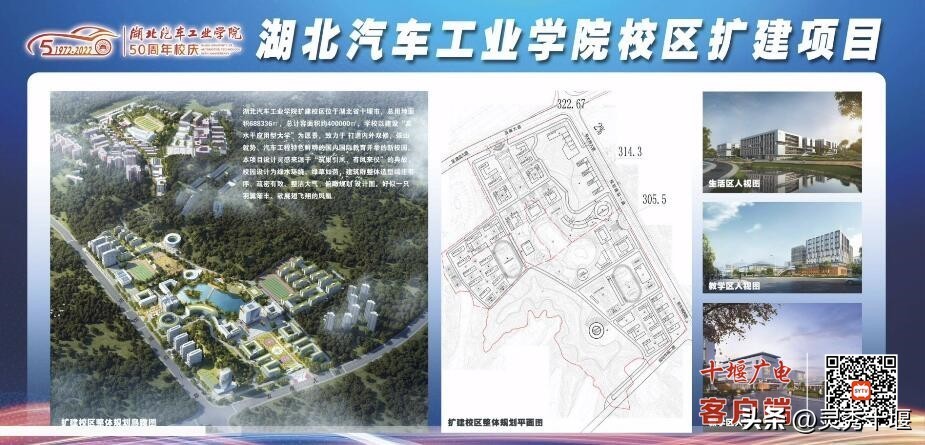 湖北汽车工业学院校区扩建项目位于张湾区,总占地面积1000亩,总建筑面积40万平方米,总投资22亿元,扩建项目包括产教融合实习实训大楼、学术交流中心、创新创业孵化中心、教学楼、图书馆、汽车博物馆、体育馆和运动场、学生公寓、教师公寓、校医院、方程式赛车场、人才公寓等。