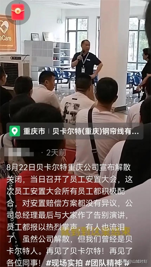 对于贝卡尔特重庆公司看的突然关闭,众多员工纷纷发出视频表示惋惜不舍,据网友新人称:公司召开员工安置大会,所有员工对赔偿方案都没有异议,公司总经理最后与大家作了告别演讲,员工都报以热烈掌声,有人流泪!网友JSF更是称其为双桥待遇最好的工厂。