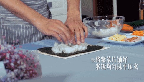 4):铺好紫菜片,米饭均匀抹平压实,留出1CM不铺米饭