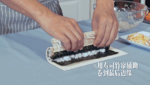 6):用寿司竹帘辅助卷到最后边缘,收蘸水抹在紫菜上,边缘就会粘合