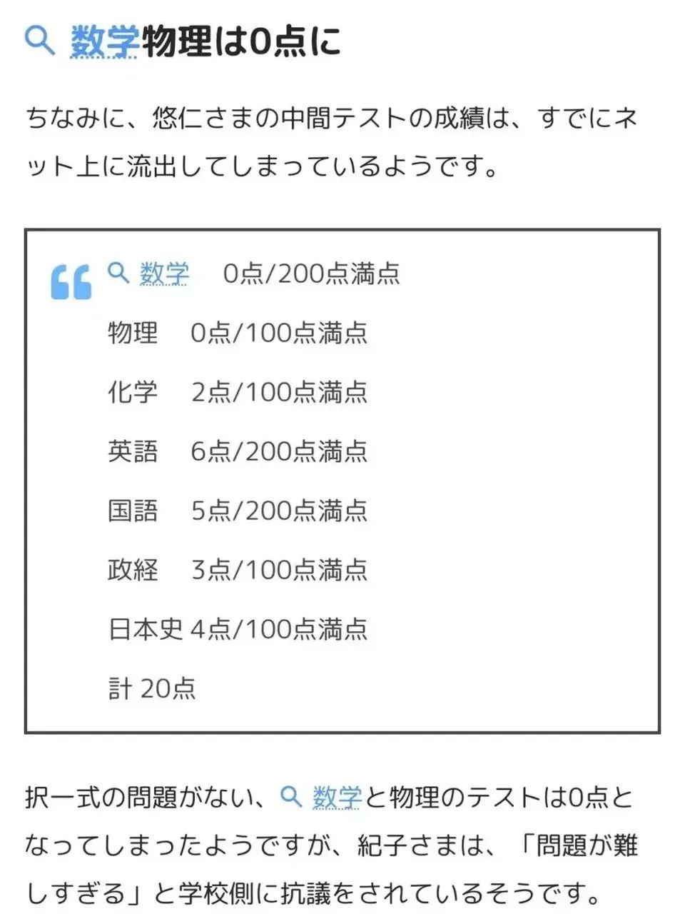 日前,爆出来的悠仁成绩单则耐人寻味了,总分1000分,只得了20分,数学和物理是0分,化学2分,英语6分,语文6分。后三科能拿到分,因为有选择题可以随意勾划答案。