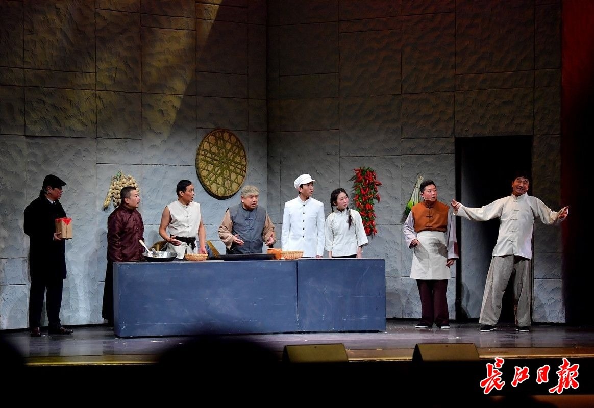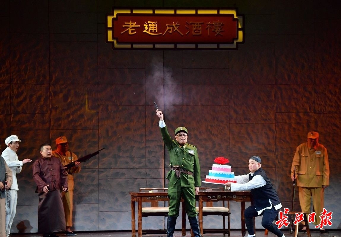 历史上,“老通城”的创始人曾厚诚不仅创立了“三鲜豆皮”的品牌,也在抗战期间接待、资助了大批爱国志士。此次首演的《老通城风云》就以喜剧的形式再现了这段“前店做生意,后店闹革命”的传奇故事。老通城酒楼的曾老板请厨师“岔巴子”去酒楼做豆皮,而此时进步人士要运出城的一大包军火却出现在酒楼大厅里,正赶上发达了的“嘎巴子”要在酒楼给母亲做寿。狭路相逢,如何让军火和爱国志士安全出城,不仅让曾老板和田掌柜想破了头,田克兢和陆鸣扮演的“岔巴子”和“嘎巴子”这对欢喜冤家也“嘴”出了新高度,仅仅一个分蛋糕、点蜡烛的情节就来来回回拉扯好几次,一波三折看得观众提心吊胆。悬疑之中还融入了曾家父子两代革命者之间的误解和情感,格外吸引人。