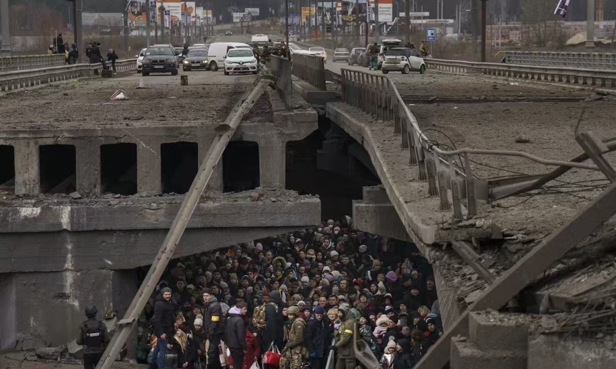 随着战火的蔓延,基辅郊区的伊尔平河边,难民们在被毁坏的桥下绝望地聚集,眼神中充满了恐惧和迷茫。他们拖着行李,步履蹒跚,仿佛在逃离一场无尽的梦魇。与此同时,波兰梅迪卡边境口岸排起的长队,正是无数人对未来的担忧与绝望的写照。