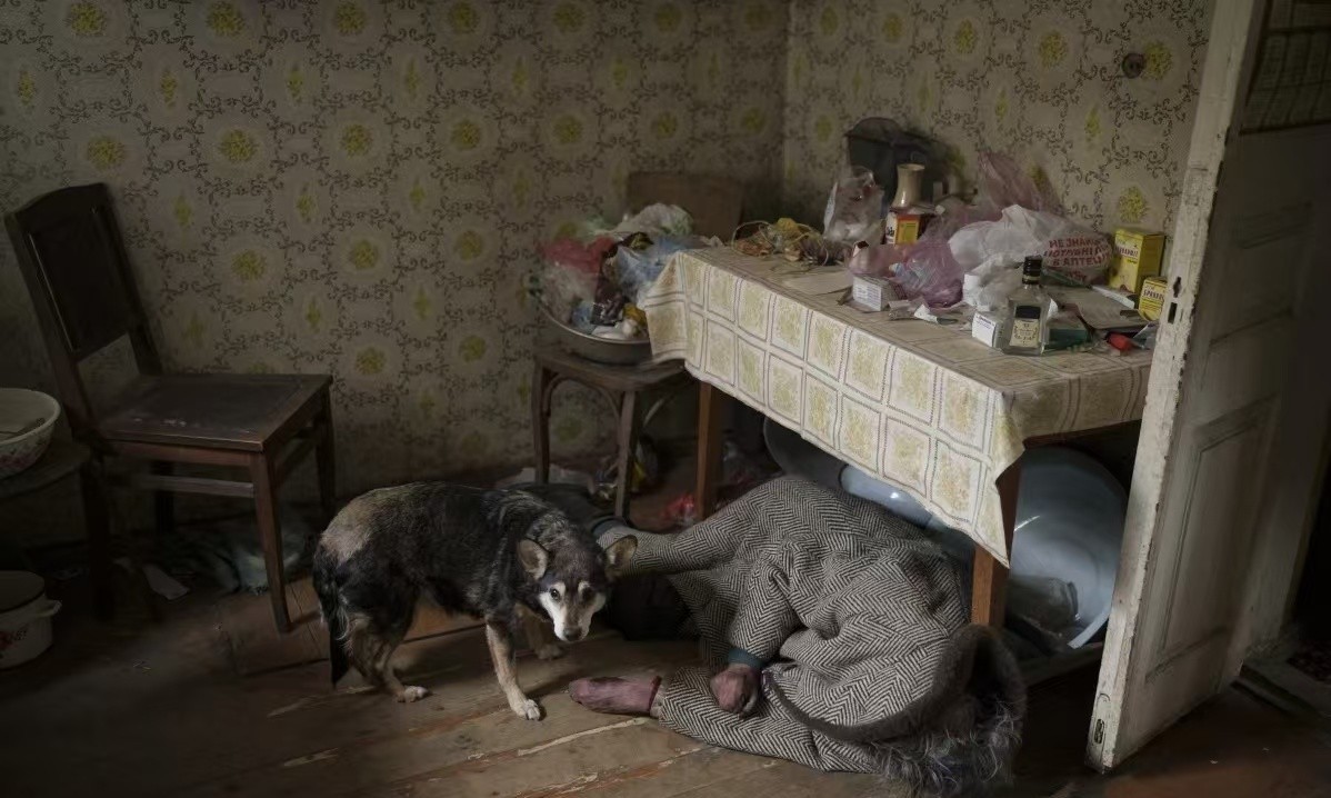 4月,在布哈的一处废墟中,一条忠诚的狗狗静静守护着主人遗体,这无声的画面胜过千言万语,展现了战争对人类情感的摧残。在利沃夫,避难的人们躲在地下室,焦急地打电话寻找失散的亲人,眼神空洞,仿佛失去了所有的希望。