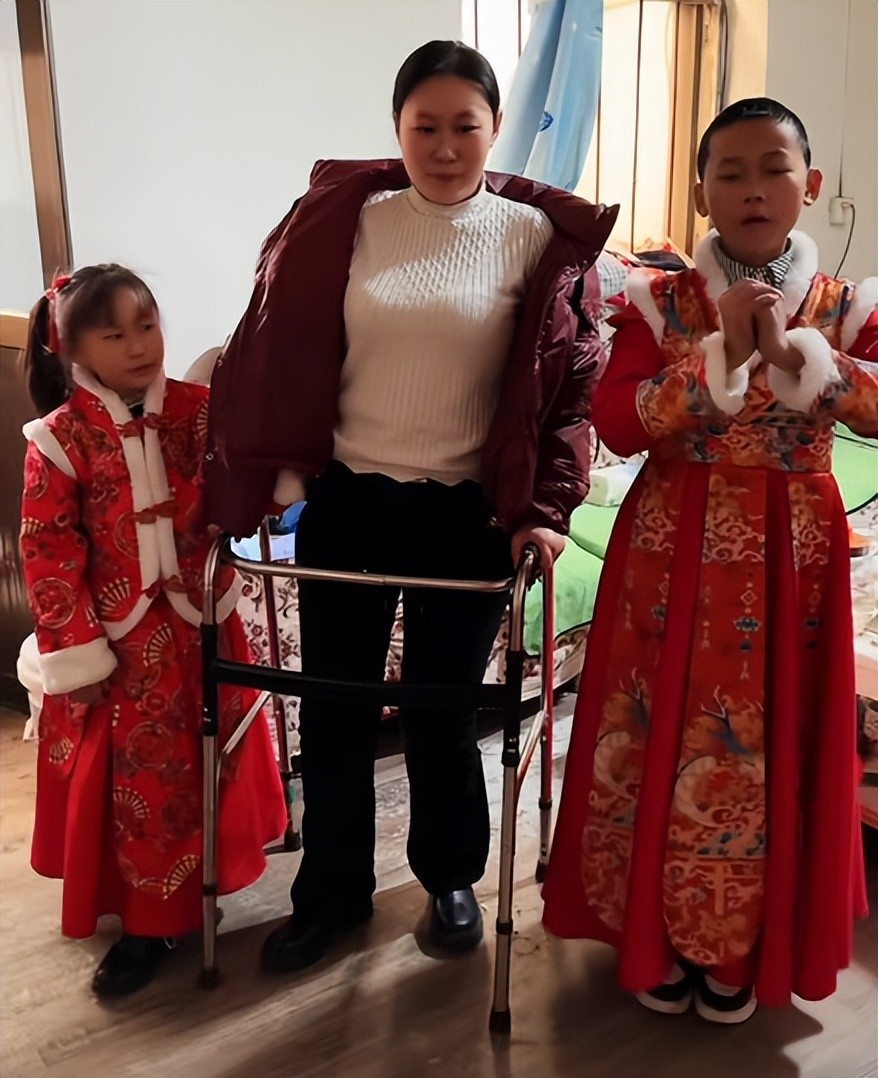 从视频中可以看出,孔燕已经可以扶着凳子站起来了,而她的儿子孔浩然个子也快要追赶上妈妈了。