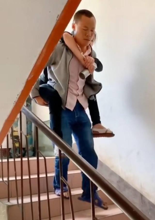 8年后,张明荣背着孔燕来到了泰山,那1545米的海拔、将近七千个台阶,普通人5个小时就能登顶,可张明荣却需要整整十二个小时。