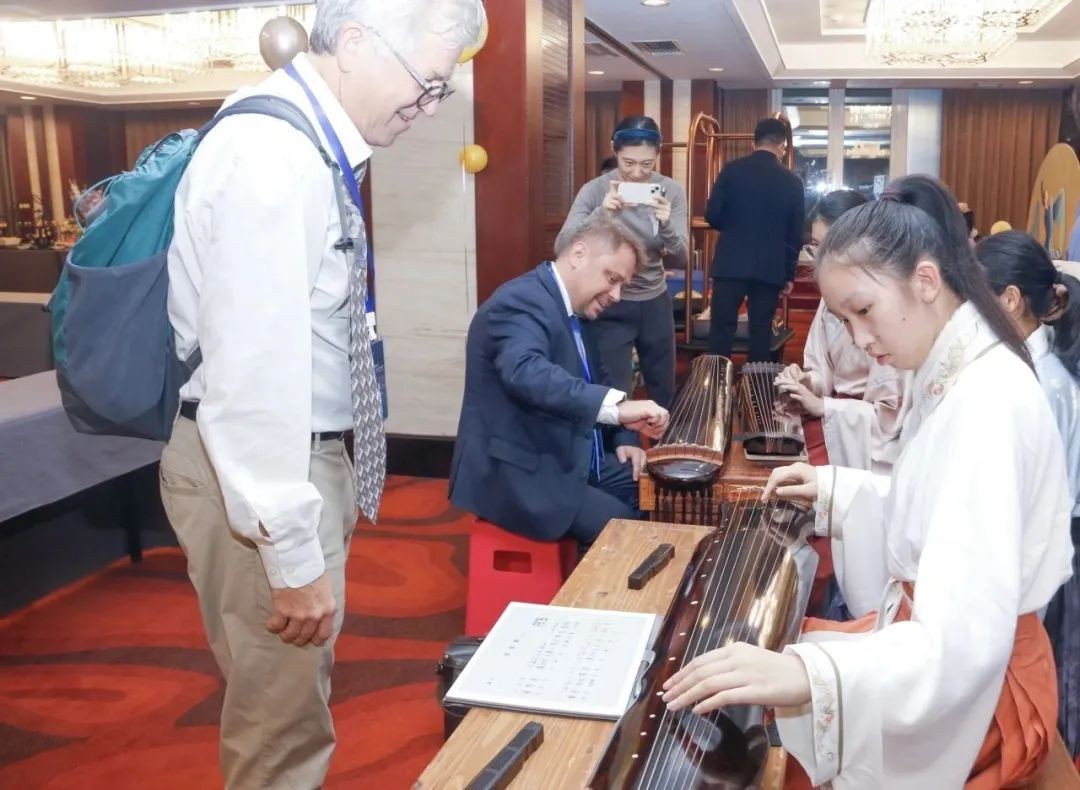 “西山友聚·雅集”文化体验环节,嘉宾们与表演同学一起进行茶文化、古琴演奏、书法、曹雪芹风筝和钩织等互动体验。