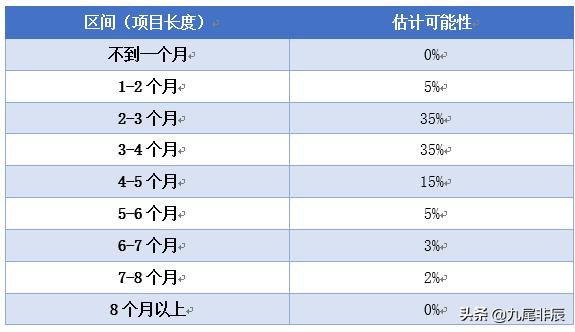 这种区间估计是需要估计几种结果的可能性,首先找出能够覆盖一切可能结果的区间,然后一个个的考虑每个区间发生的可能性,并且进行预测估计,比如《崩溃》中提到的案例,一个项目的耗时长短的预测: