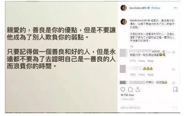 老公陈建州心疼不已,在9月14日发文力挺爱妻:“亲爱的,善良是你的优点,但是不要让它成为了别人欺负你的弱点。只要记得做一个善良和好的人,但是永远都不要为了去证明自己是一善良的人而浪费你的时间。”