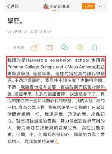 今年5月9日,范玮琪发长文回应学历一事,她称自己读的是Harvard's extension school,也读过Pomona College,Scripps and UMass Amherst,并未伪装学历。