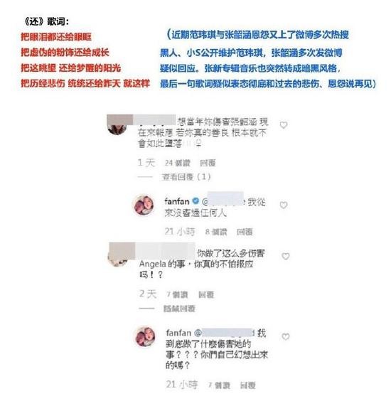 网友还翻出了范玮琪与张韶涵的陈年恩怨,直言范玮琪伤害张韶涵,称张韶涵人生低谷被范玮琪火上浇油,张韶涵认识范玮琪是遇人不淑,范玮琪公开回应“我到底做了什么伤害她(张韶涵)的事,你们自己幻想出来的吗”,对于网络攻击,范玮琪非常气愤。