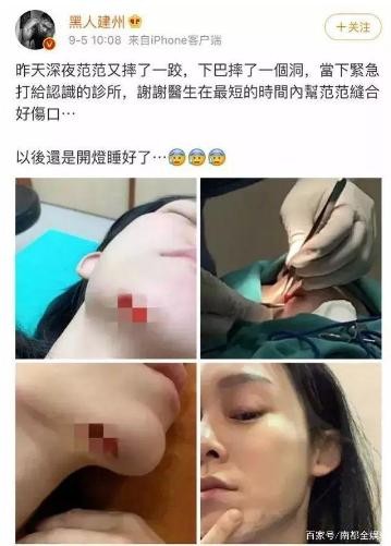 9月4日,范玮琪在社交网站发文称自己摔倒流血,这次撞伤了下巴位置,还晒照片给大家看,伤口很深,皮肉外翻肌肉组织都看到,血淋淋很恐怖,她及时去医院接受治疗,缝了15针。