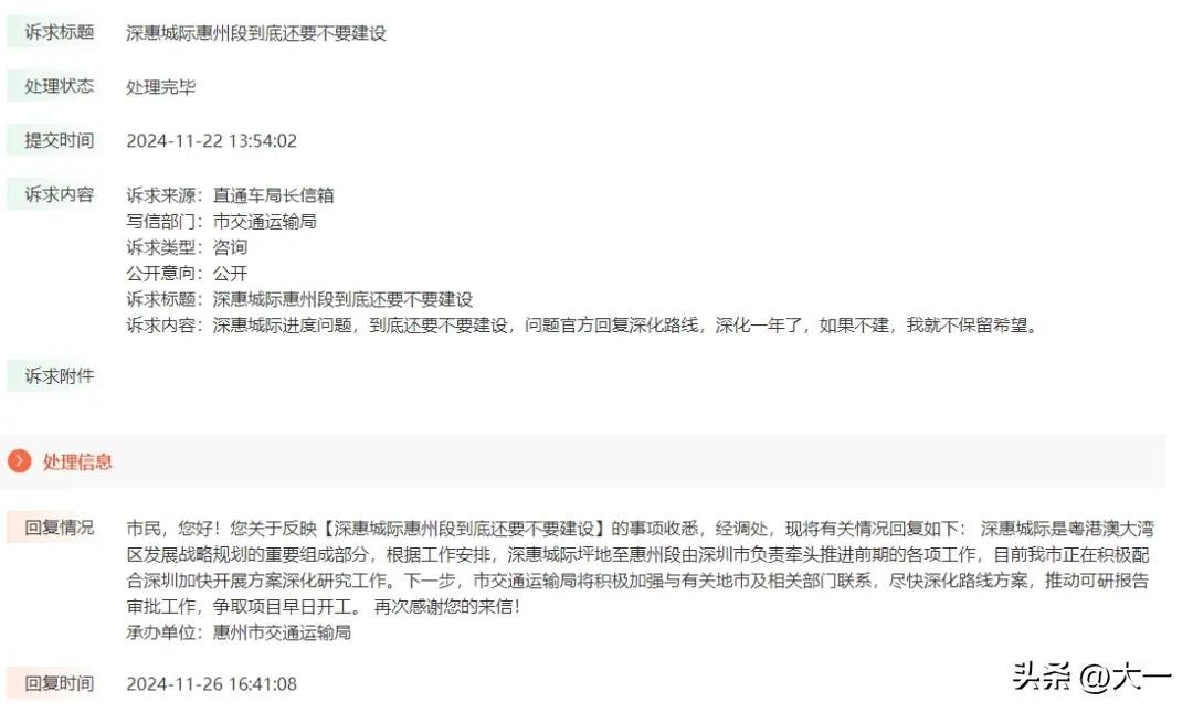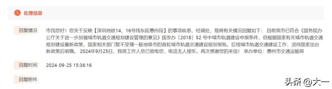 大湾区官方回复:深大城际项目近期实施段止于坪山聚龙站,惠州段(坪山-大亚湾)为远期预留研究项目。