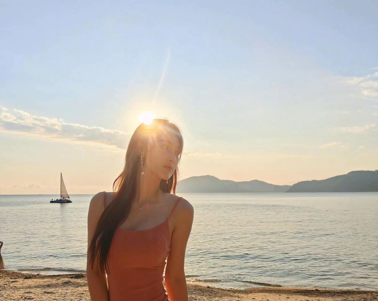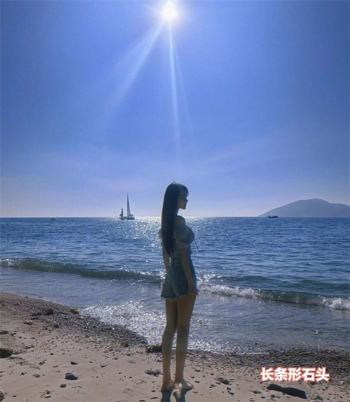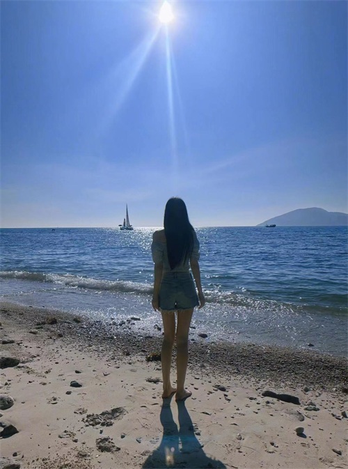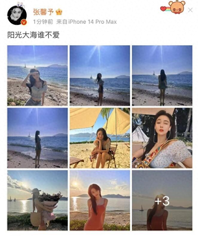 张馨予的背影与蓝色的大海和阳光结合在一起,像是一幅充满美好的风景画。