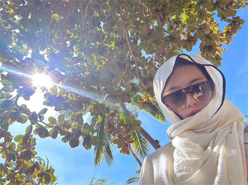 阳光太强烈的时候,张馨予也会戴上头巾遮挡紫外线,防晒对于靠脸吃饭的明星们来说,可是相当重要的一个环节。