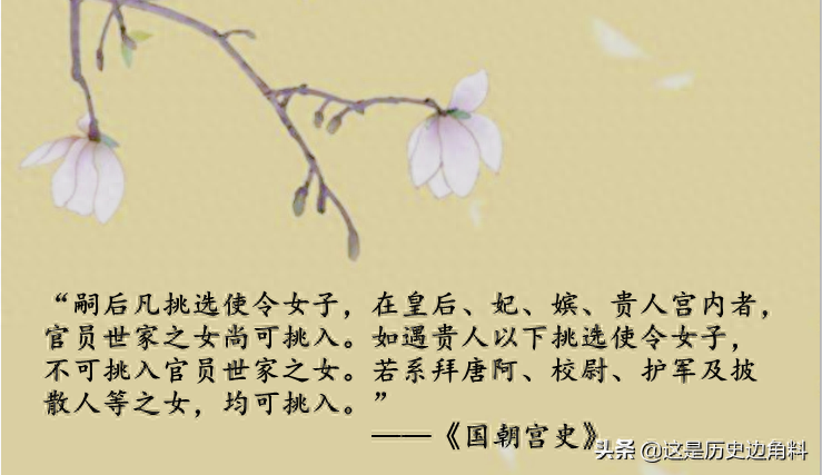 据此可知,清代挑选宫女也是需要考虑身份地位的,世家之女或可为官女子,官女子不同于一般的宫女,不必承担杂役辛苦,并且有明确的品级和晋升渠道,与一般宫女相比大有不同。